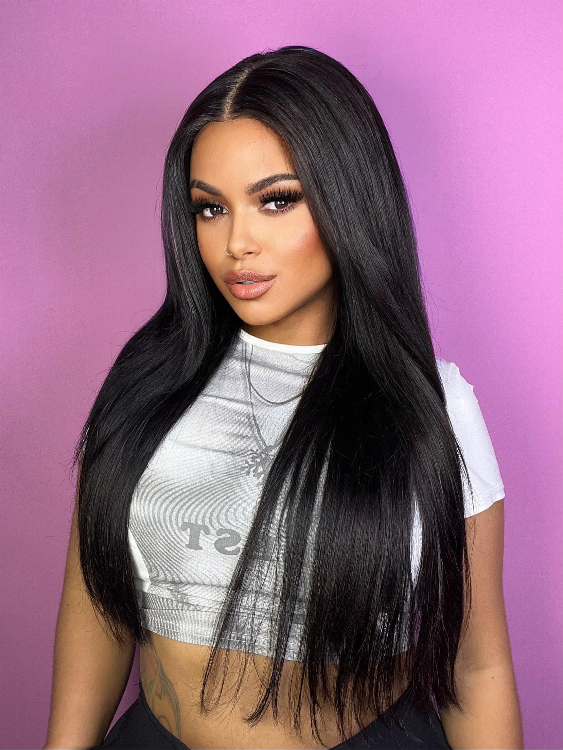 Su largo de 28 pulgadas proyecta feminidad y poder, mientras que su color negro intenso aporta un brillo natural que nunca pasa desapercibido. Con su frontal 13x4 de partida libre, podrás personalizar el estilo con total libertad: raya al medio, de lado o hacia atrás, adaptándose perfectamente a tu rostro y personalidad.