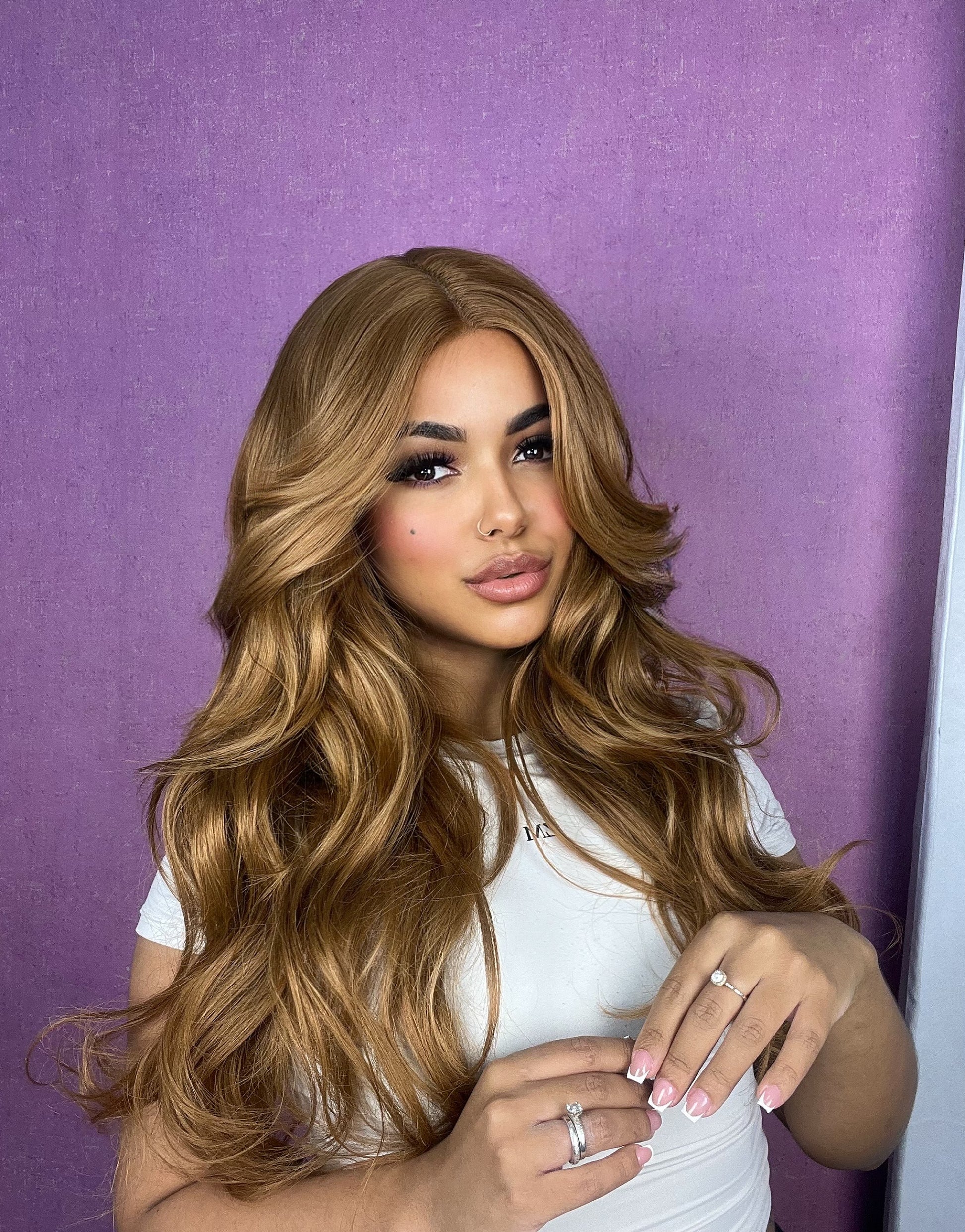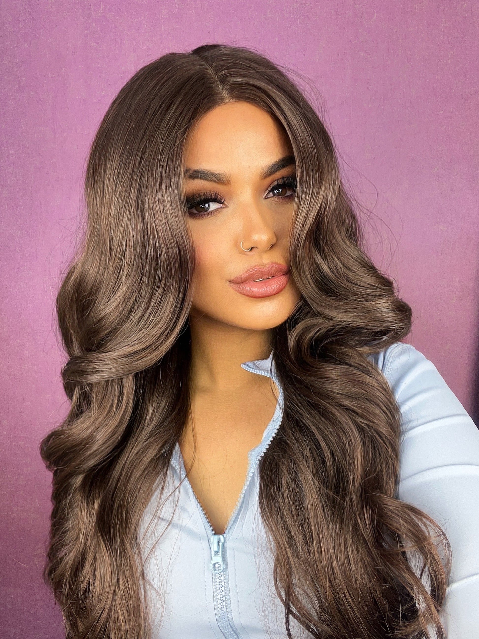 Peluca ondulada con frontal partida fija, confeccionada con fibra semi humana resistente al calor hasta 250 °C. Su textura ondulada y caída suave aportan un look natural, elegante y con movimiento.