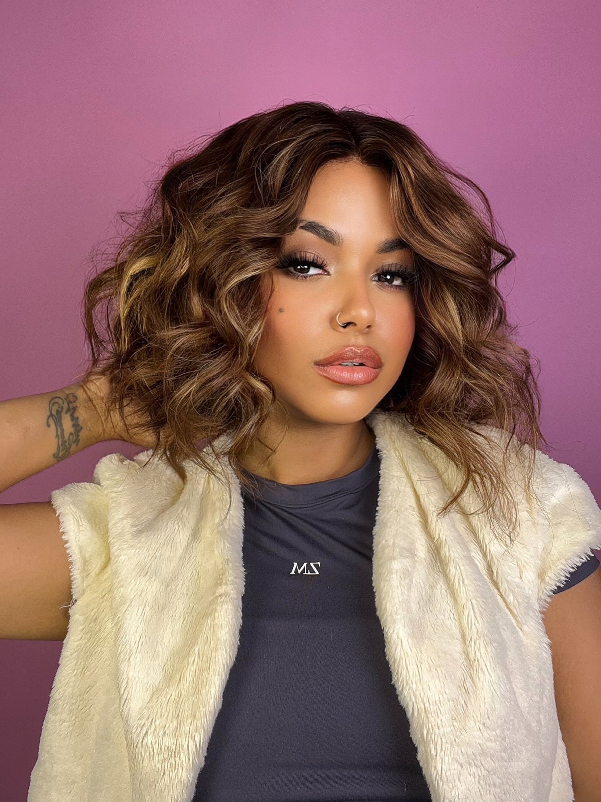 Su corte Bob ondulado combina la sofisticación clásica con la frescura moderna, mientras que el tono caoba con mechas rubias ilumina el rostro y realza cada movimiento con brillo natural.
